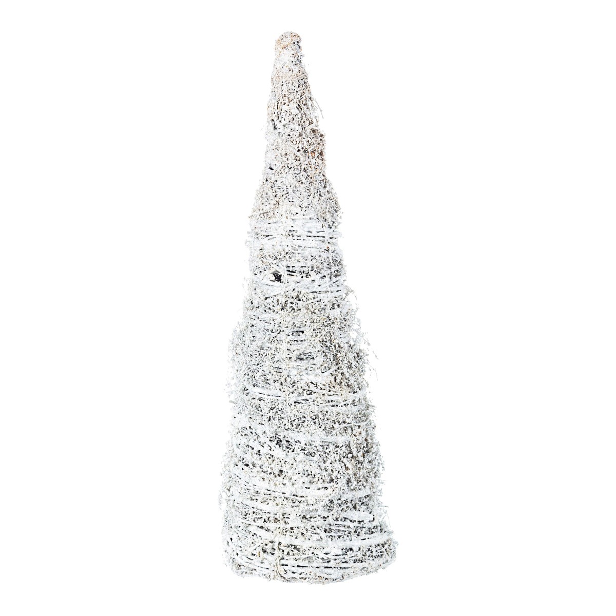 Nieve forestal en forma cónica: Cono Forest Blanco de 40 cm de altura. Esta decoración natural simula un árbol de abeto nevado en miniatura. Fabricado con ramas de pino auténticas cubiertas de efecto nieve blanca, cada cono es único. Su altura de 40 cm es perfecta para mesas, estanterías o composiciones medianas. La combinación de verde pino y blanco nevado evoca el bosque invernal. Material natural y sostenible. ¡La esencia forestal nevado en volumen!